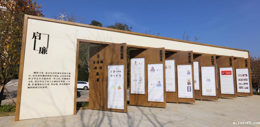 廉政文化广场位于南校区善思楼右侧,面积约1625平方米,以“无规矩不成方圆”为设计理念,以中轴对称为核心设计方向发散四周,动线以回字形为主动线进行布局,围绕“廉”字主题,廉政文化广场共分为清廉墙、启廉、论廉、思廉、修廉、五个部分。